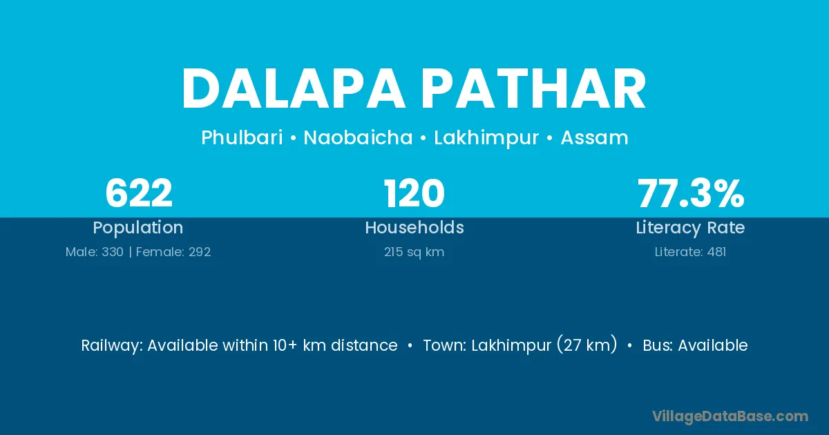 Lakhimpur (27 km) is the nearest town to Dalapa Pathar village for major economic activities and is located approximately 27 km away.