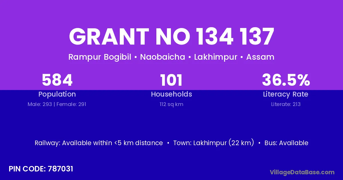 Lakhimpur (22 km) is the nearest town to Grant No 134 137 village for major economic activities and is located approximately 22 km away.