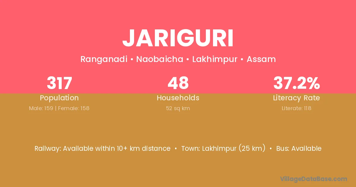Jariguri village has a total population of 317 people, of which 159 are males and 158 are females.