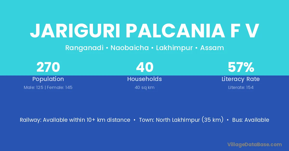 North Lakhimpur (35 km) is the nearest town to Jariguri Palcania F V village for major economic activities and is located approximately 35 km away.