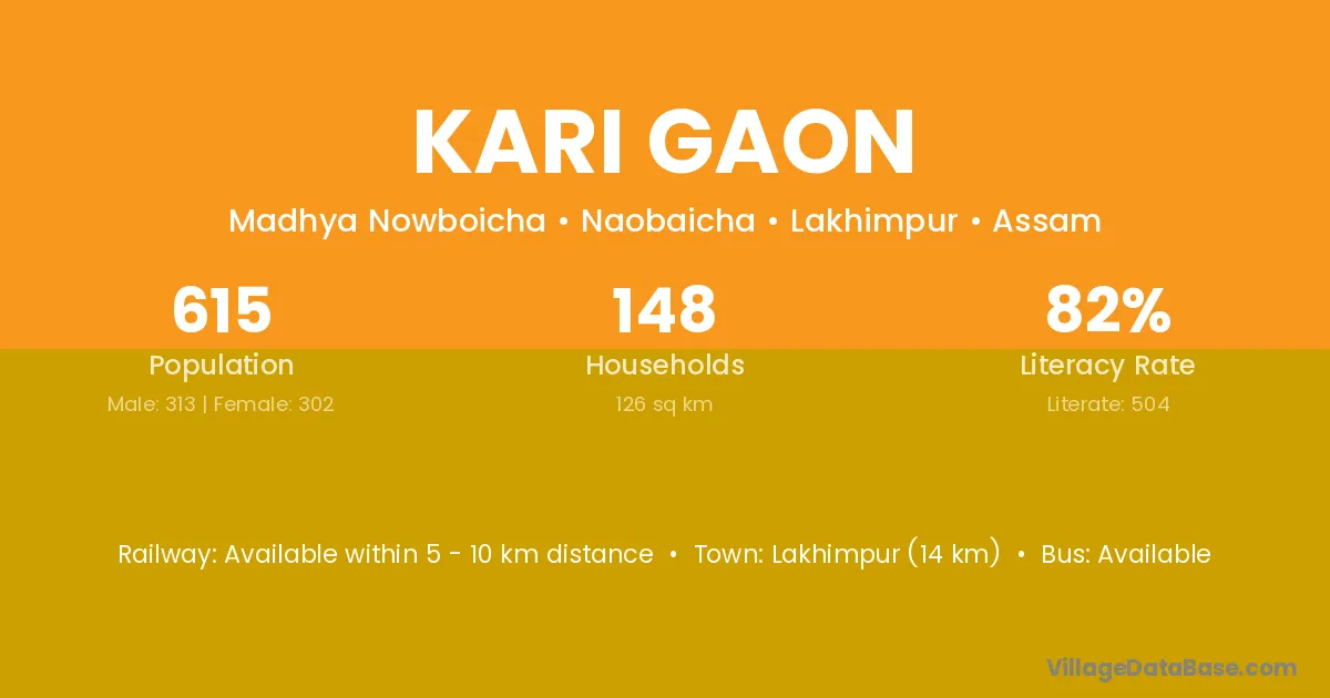 Lakhimpur (14 km) is the nearest town to Kari Gaon village for major economic activities and is located approximately 14 km away.