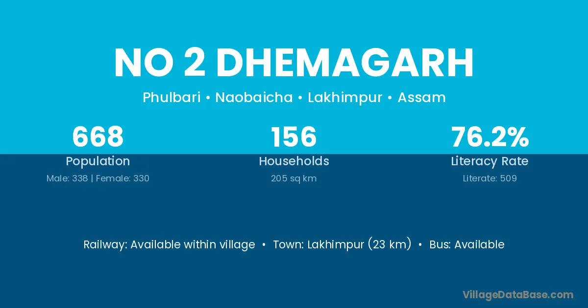 Lakhimpur (23 km) is the nearest town to No 2 Dhemagarh village for major economic activities and is located approximately 23 km away.