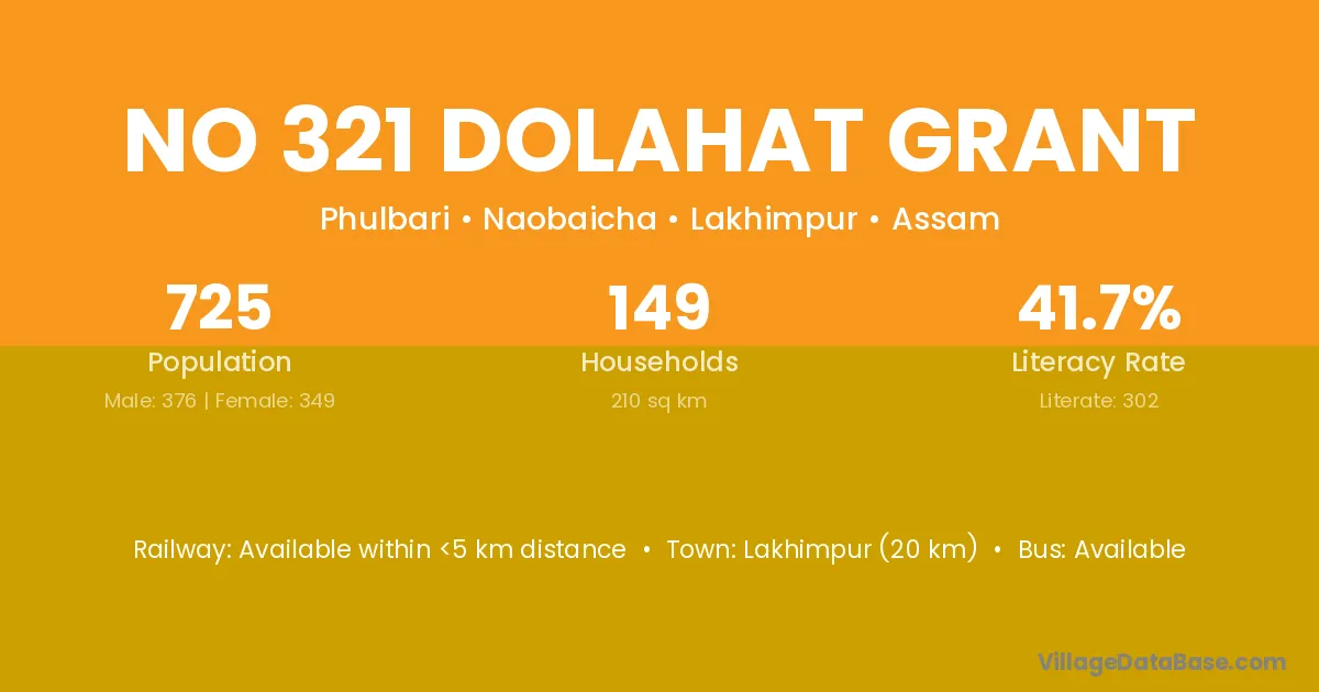 Lakhimpur (20 km) is the nearest town to No 321 Dolahat Grant village for major economic activities and is located approximately 20 km away.