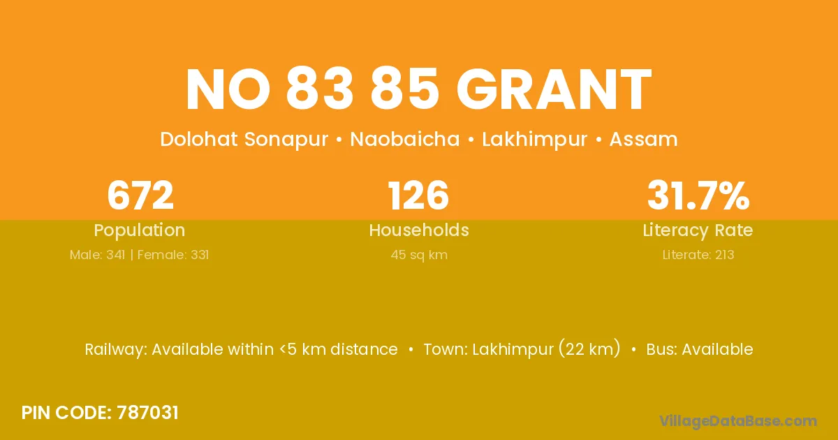 Lakhimpur (22 km) is the nearest town to No 83 85 Grant village for major economic activities and is located approximately 22 km away.