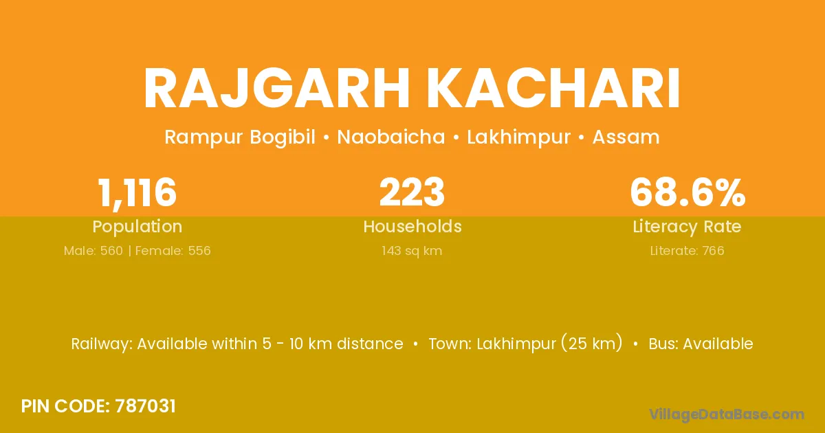 Lakhimpur (25 km) is the nearest town to Rajgarh Kachari village for major economic activities and is located approximately 25 km away.