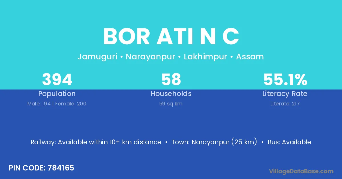Bor Ati N C village has a total population of 394 people, of which 194 are males and 200 are females.