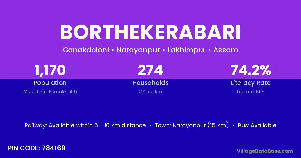 Borthekerabari village has a total population of 1,170 people, of which 575 are males and 595 are females.