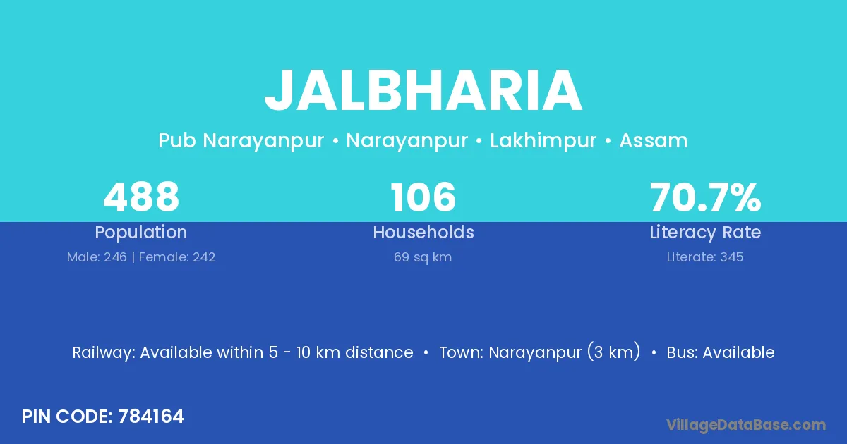 Narayanpur (3 km) is the nearest town to Jalbharia village for major economic activities and is located approximately 3 km away.