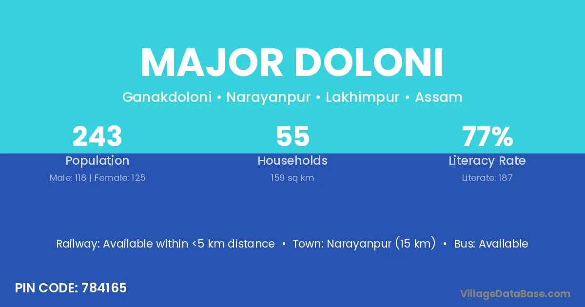 Major Doloni village has a total population of 243 people, of which 118 are males and 125 are females.