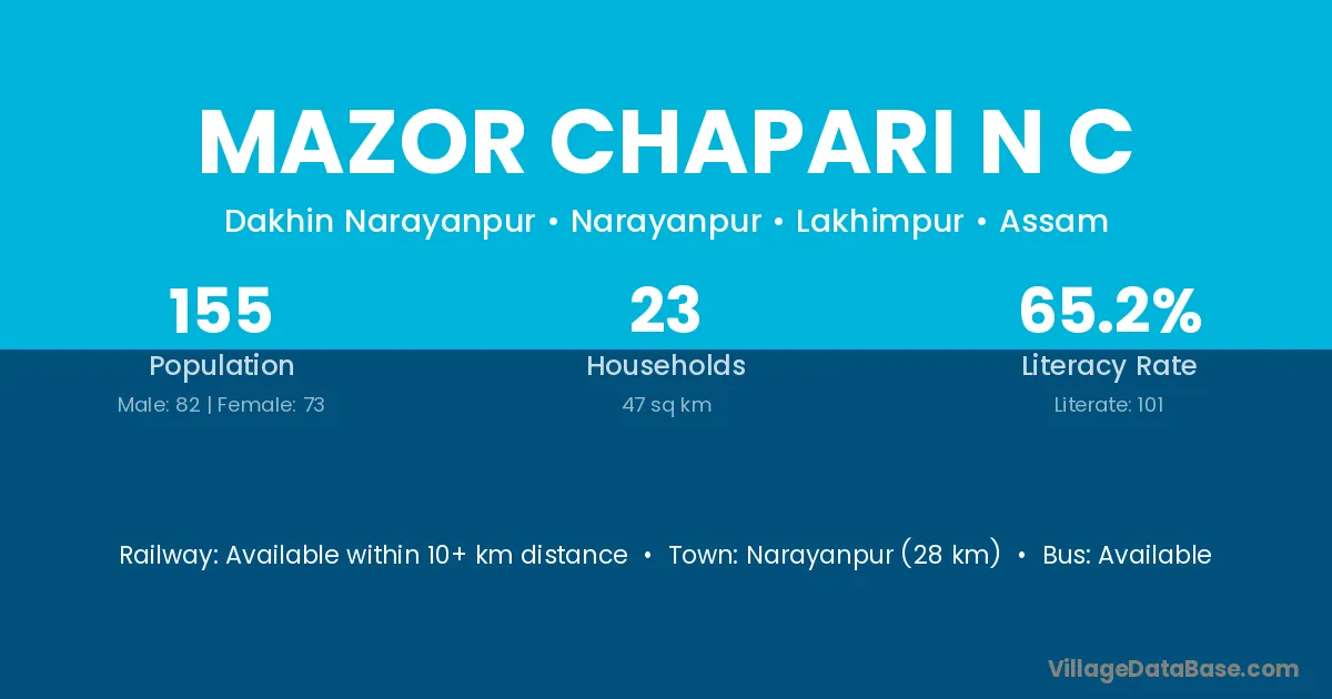 Mazor Chapari N C village has a total population of 155 people, of which 82 are males and 73 are females.
