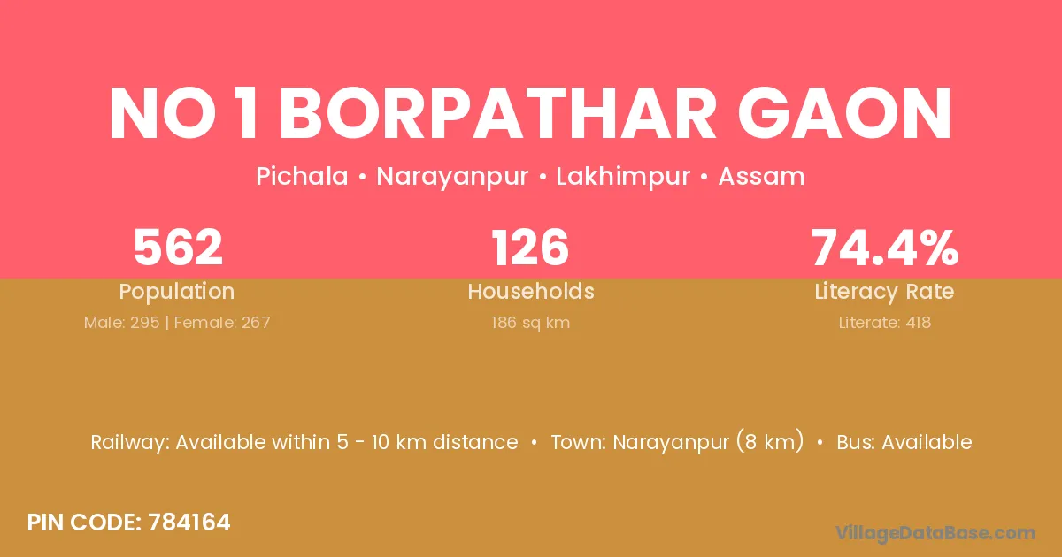 No 1 Borpathar Gaon village has a total population of 562 people, of which 295 are males and 267 are females.