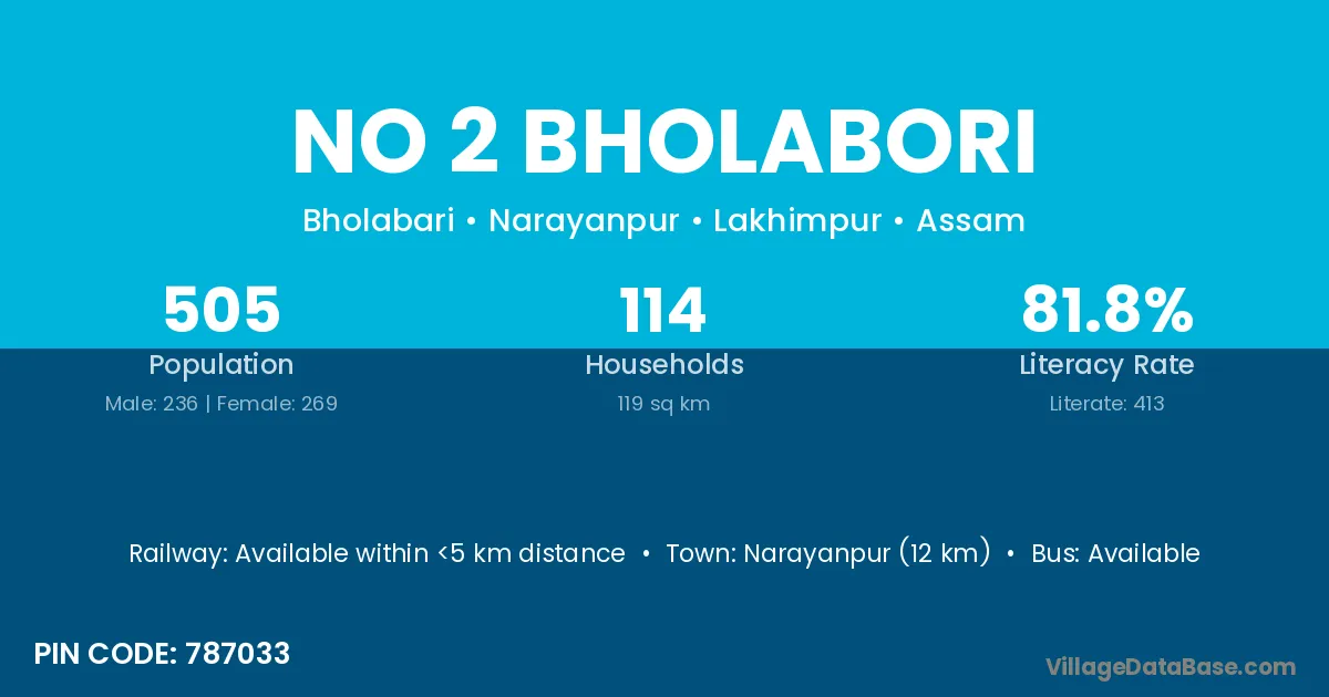 No 2 Bholabori village has a total population of 505 people, of which 236 are males and 269 are females.