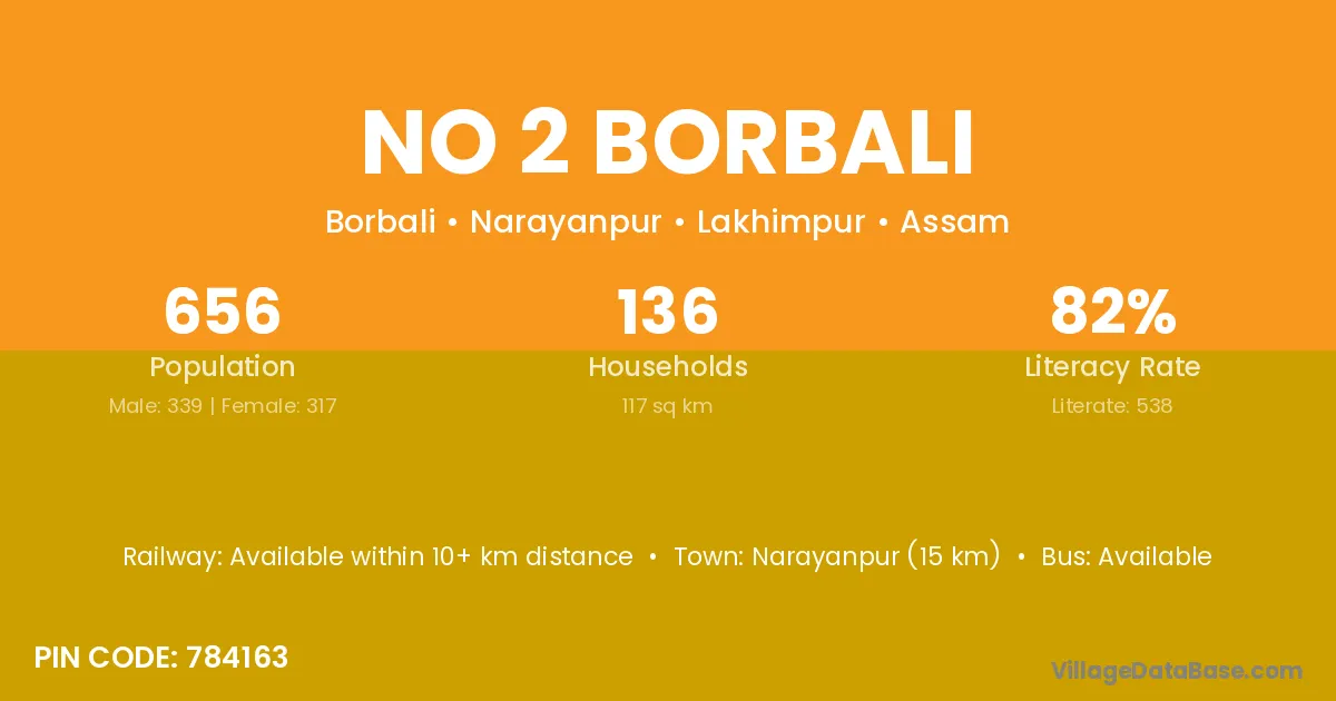 The literacy rate of No 2 Borbali village is 82.01%. Male literacy stands at 86.14% and female literacy at 77.60%.