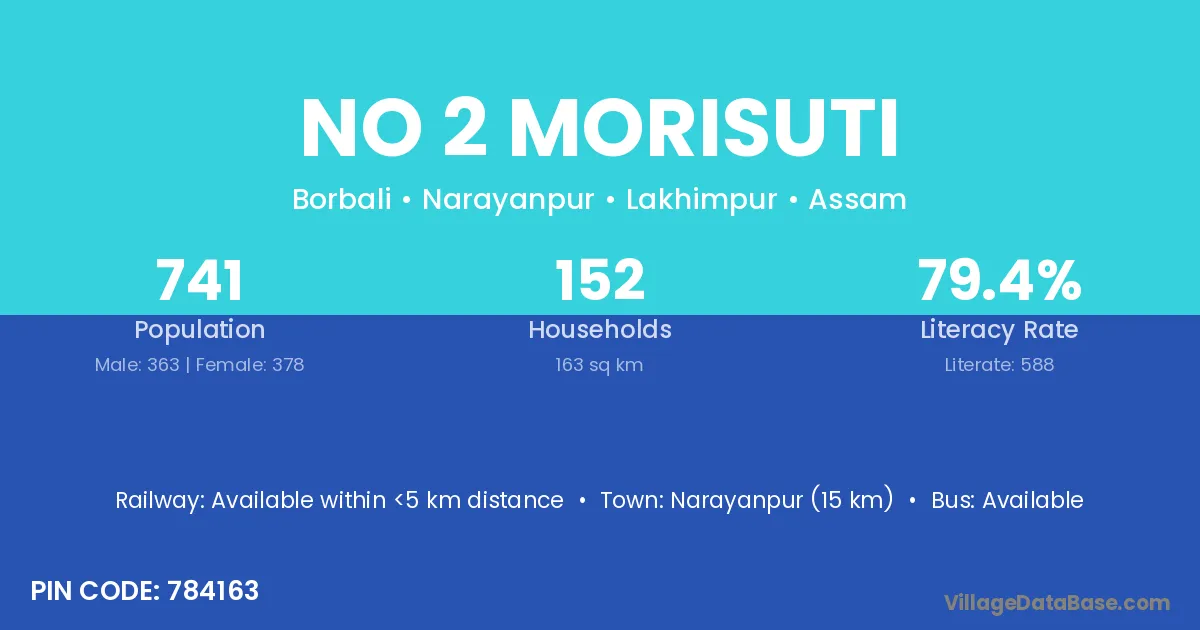 No 2 Morisuti village has a total population of 741 people, of which 363 are males and 378 are females.