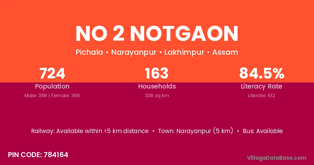 No 2 Notgaon village has a total population of 724 people, of which 358 are males and 366 are females.