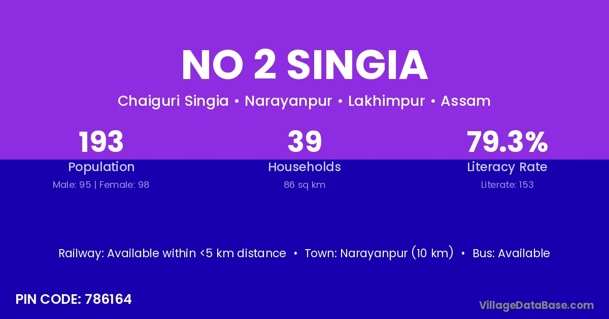 No 2 Singia village has a total population of 193 people, of which 95 are males and 98 are females.