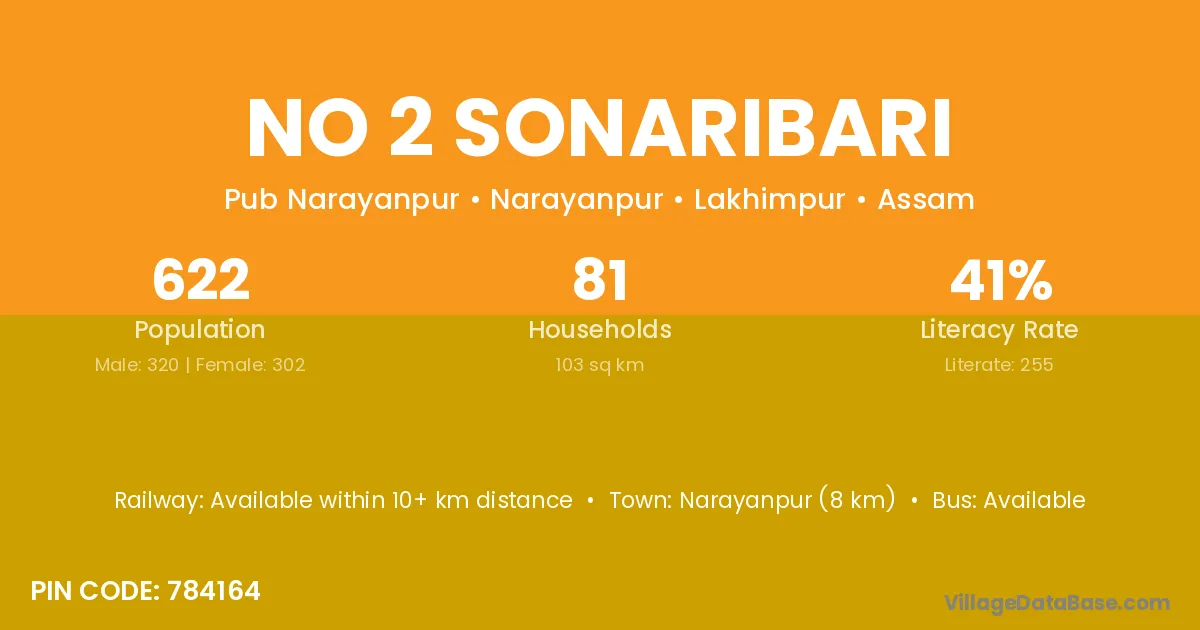 Narayanpur (8 km) is the nearest town to No 2 Sonaribari village for major economic activities and is located approximately 8 km away.