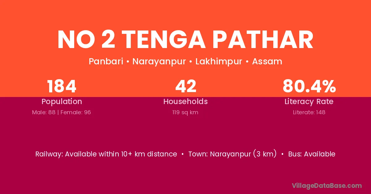 No 2 Tenga Pathar village has a total population of 184 people, of which 88 are males and 96 are females.