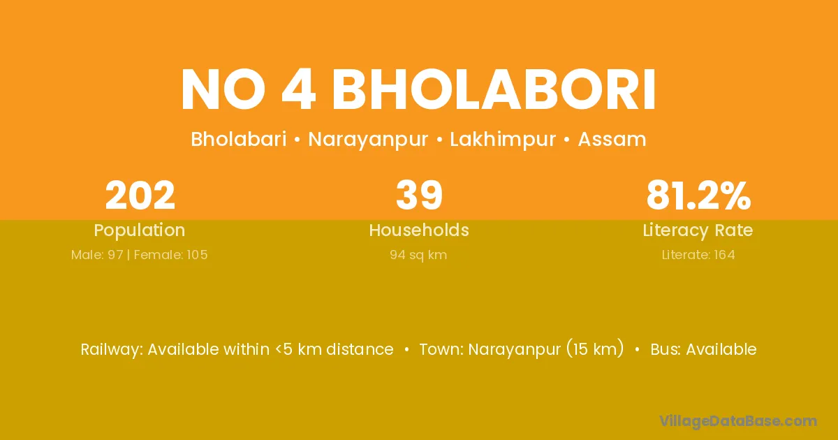 No 4 Bholabori village has a total population of 202 people, of which 97 are males and 105 are females.