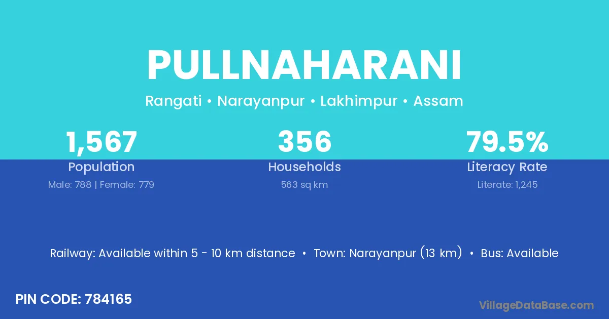Narayanpur (13 km) is the nearest town to Pullnaharani village for major economic activities and is located approximately 13 km away.