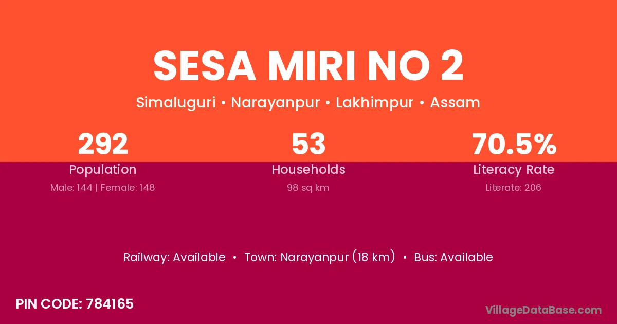 Sesa Miri No 2 village has a total population of 292 people, of which 144 are males and 148 are females.