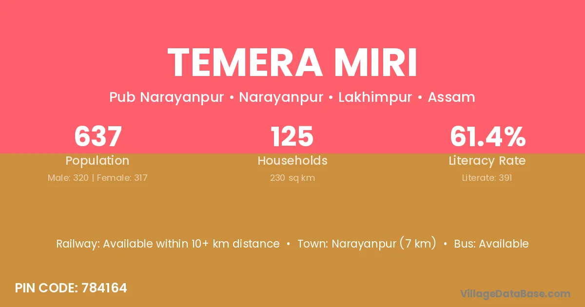 Temera Miri village has a total population of 637 people, of which 320 are males and 317 are females.