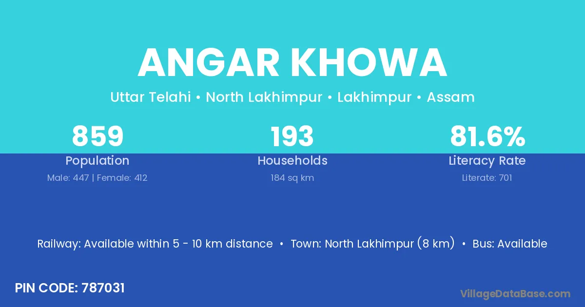 North Lakhimpur (8 km) is the nearest town to Angar Khowa village for major economic activities and is located approximately 8 km away.