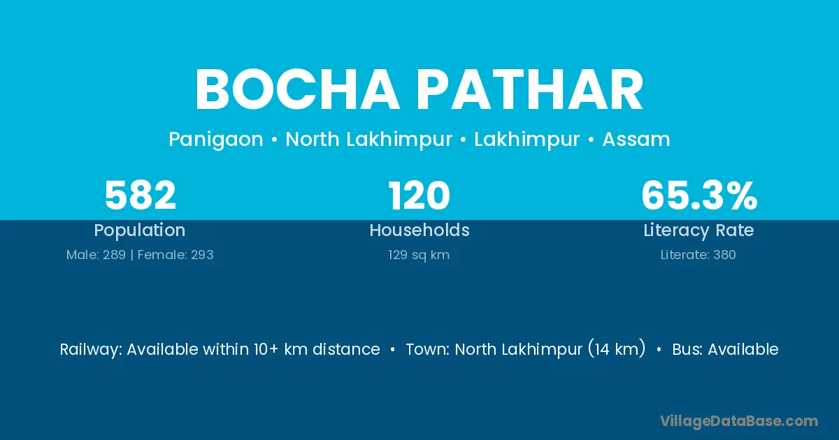 North Lakhimpur (14 km) is the nearest town to Bocha Pathar village for major economic activities and is located approximately 14 km away.