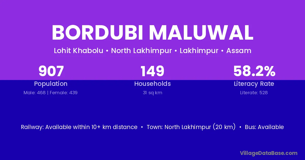 North Lakhimpur (20 km) is the nearest town to Bordubi Maluwal village for major economic activities and is located approximately 20 km away.