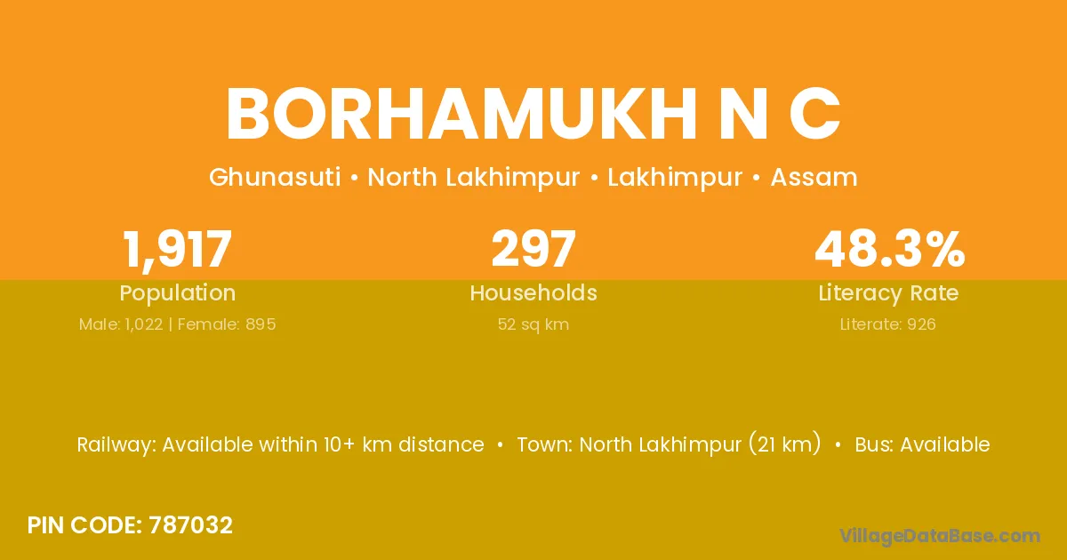 North Lakhimpur (21 km) is the nearest town to Borhamukh N C village for major economic activities and is located approximately 21 km away.