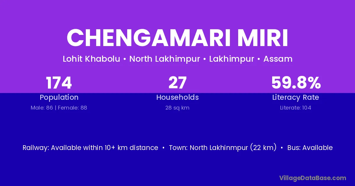 Chengamari Miri village has a total population of 174 people, of which 86 are males and 88 are females.