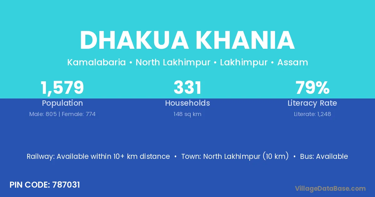 North Lakhimpur (10 km) is the nearest town to Dhakua Khania village for major economic activities and is located approximately 10 km away.