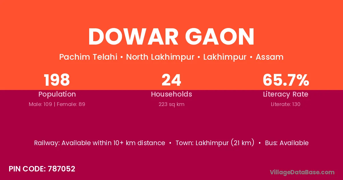 Lakhimpur (21 km) is the nearest town to Dowar Gaon village for major economic activities and is located approximately 21 km away.