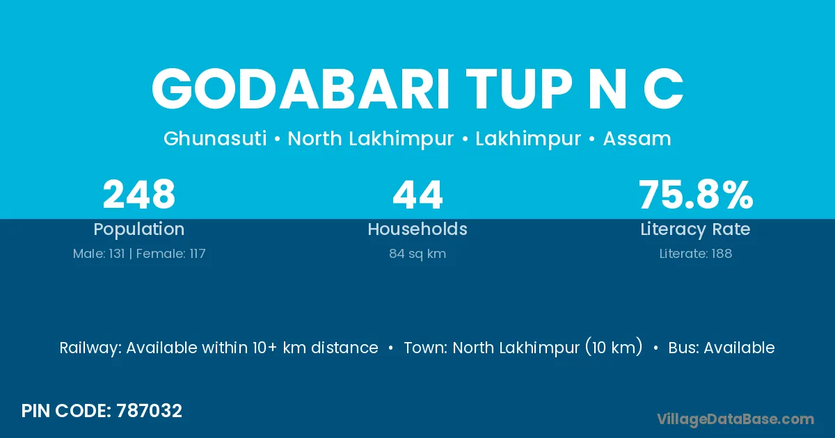 North Lakhimpur (10 km) is the nearest town to Godabari Tup N C village for major economic activities and is located approximately 10 km away.