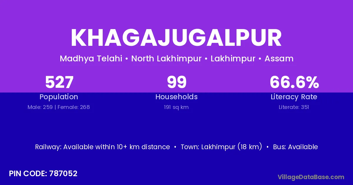 Lakhimpur (18 km) is the nearest town to Khagajugalpur village for major economic activities and is located approximately 18 km away.