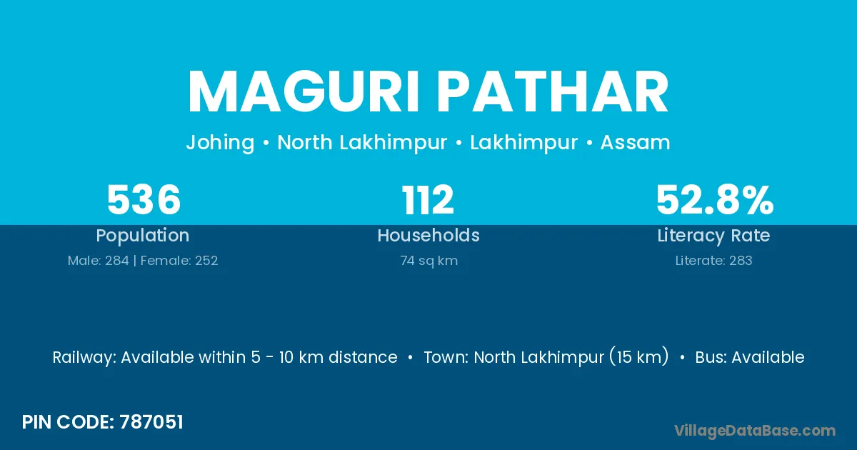North Lakhimpur (15 km) is the nearest town to Maguri Pathar village for major economic activities and is located approximately 15 km away.