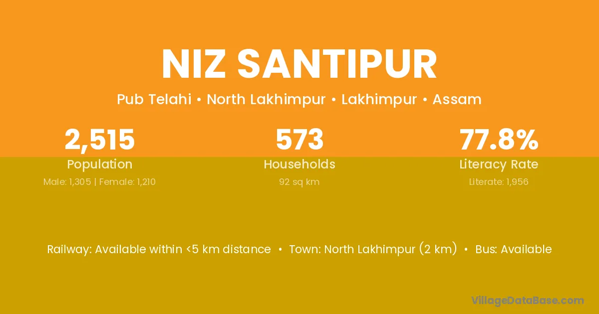 North Lakhimpur (2 km) is the nearest town to Niz Santipur village for major economic activities and is located approximately 2 km away.