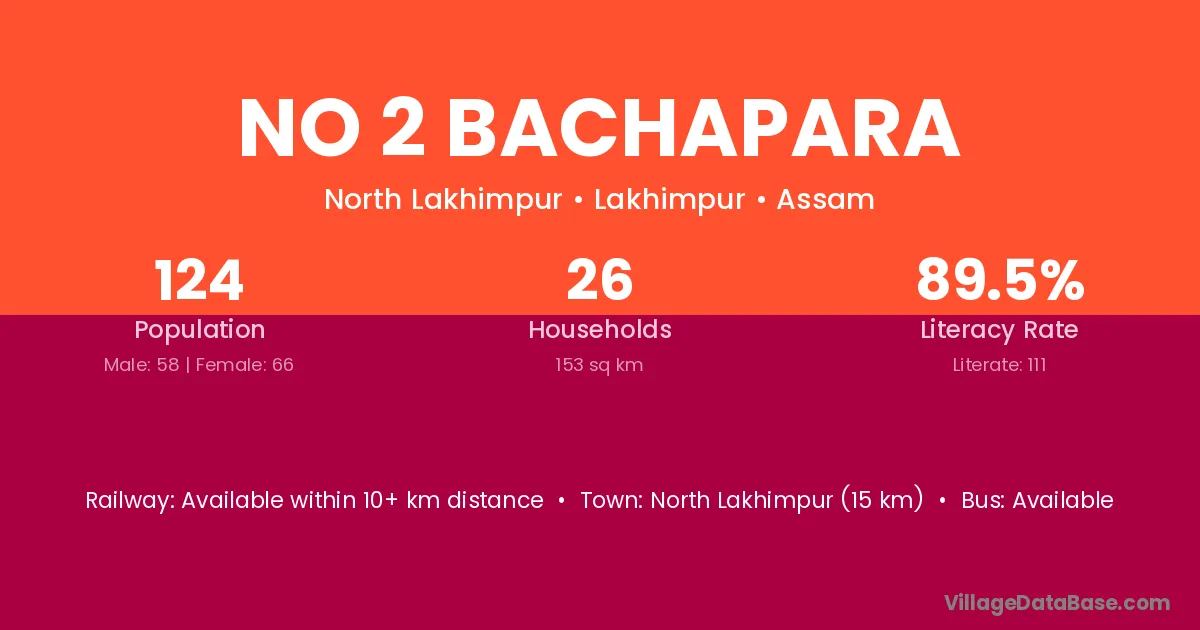 North Lakhimpur (15 km) is the nearest town to No 2 Bachapara village for major economic activities and is located approximately 15 km away.