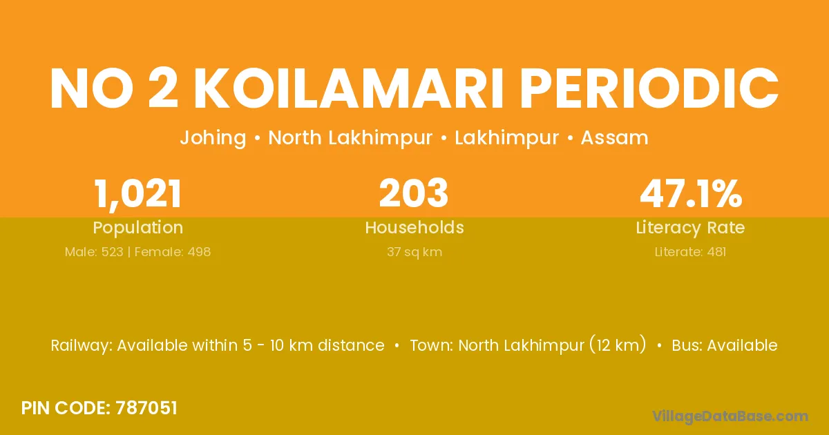 No 2 Koilamari Periodic village has a total population of 1,021 people, of which 523 are males and 498 are females.