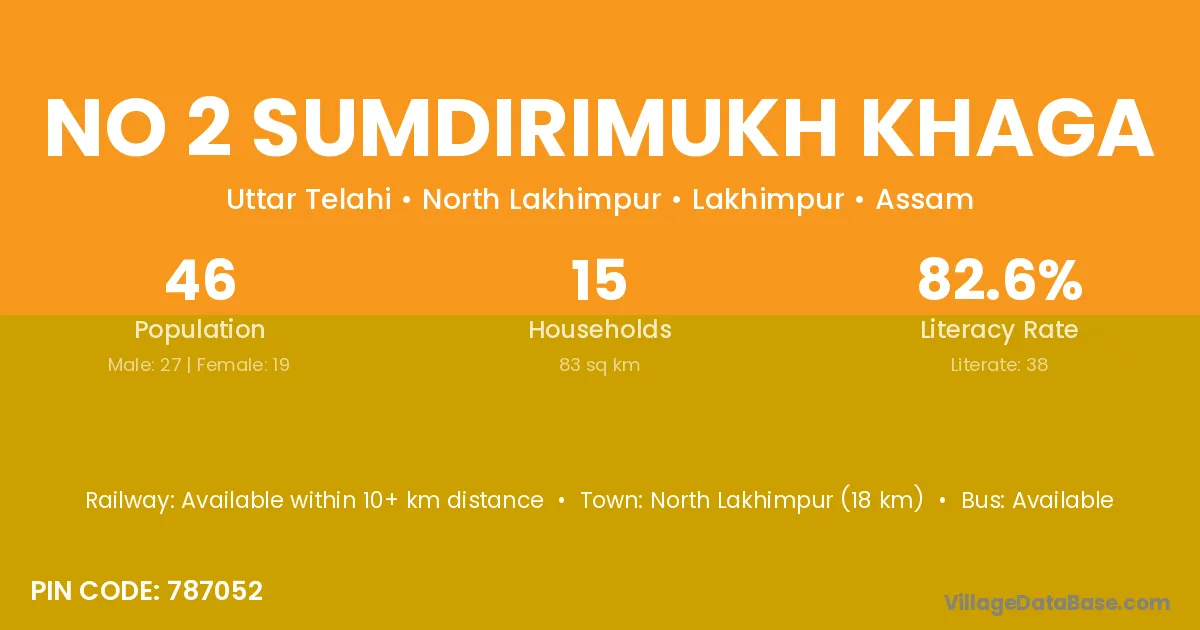 North Lakhimpur (18 km) is the nearest town to No 2 Sumdirimukh Khaga village for major economic activities and is located approximately 18 km away.