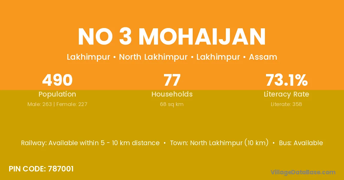 North Lakhimpur (10 km) is the nearest town to No 3 Mohaijan village for major economic activities and is located approximately 10 km away.