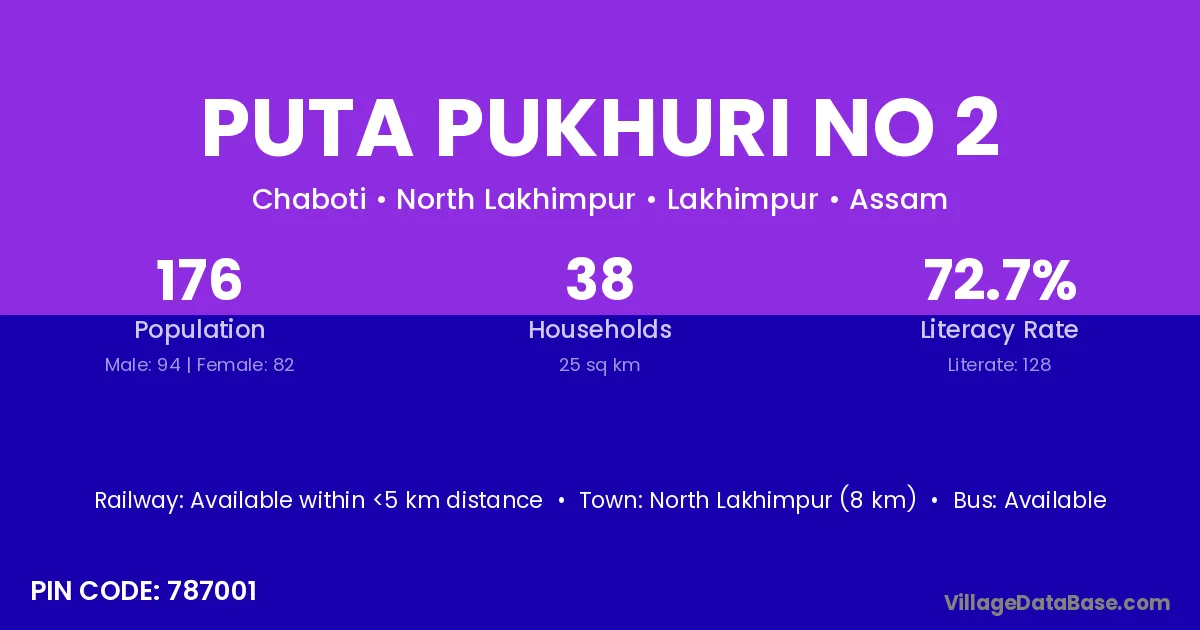 North Lakhimpur (8 km) is the nearest town to Puta Pukhuri No 2 village for major economic activities and is located approximately 8 km away.