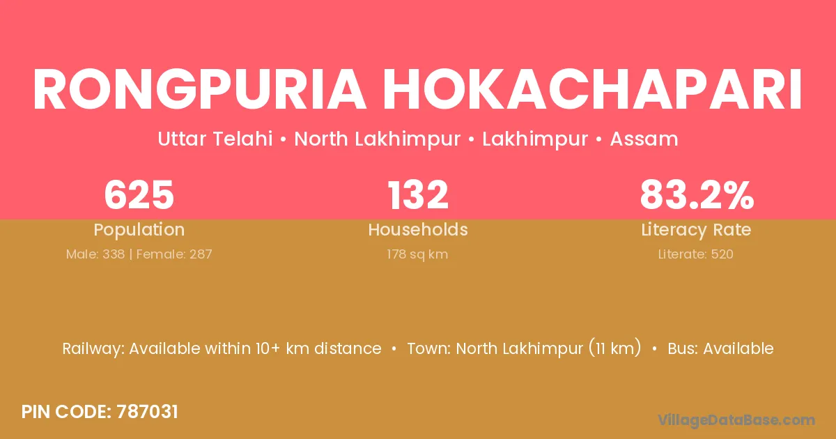 North Lakhimpur (11 km) is the nearest town to Rongpuria Hokachapari village for major economic activities and is located approximately 11 km away.