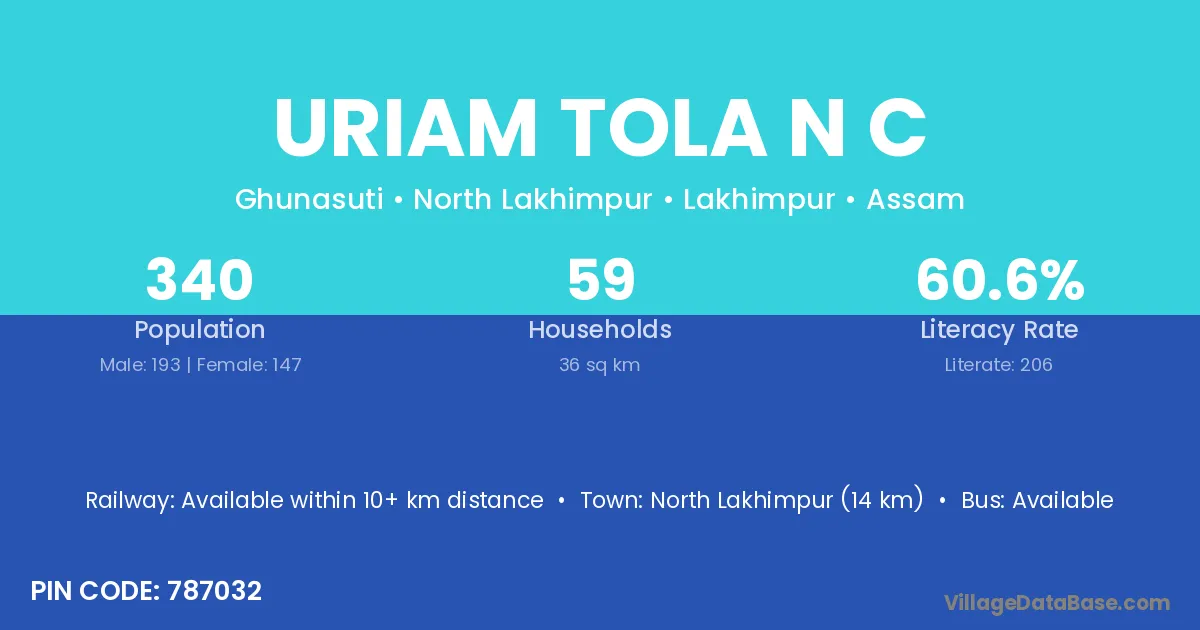 North Lakhimpur (14 km) is the nearest town to Uriam Tola N C village for major economic activities and is located approximately 14 km away.