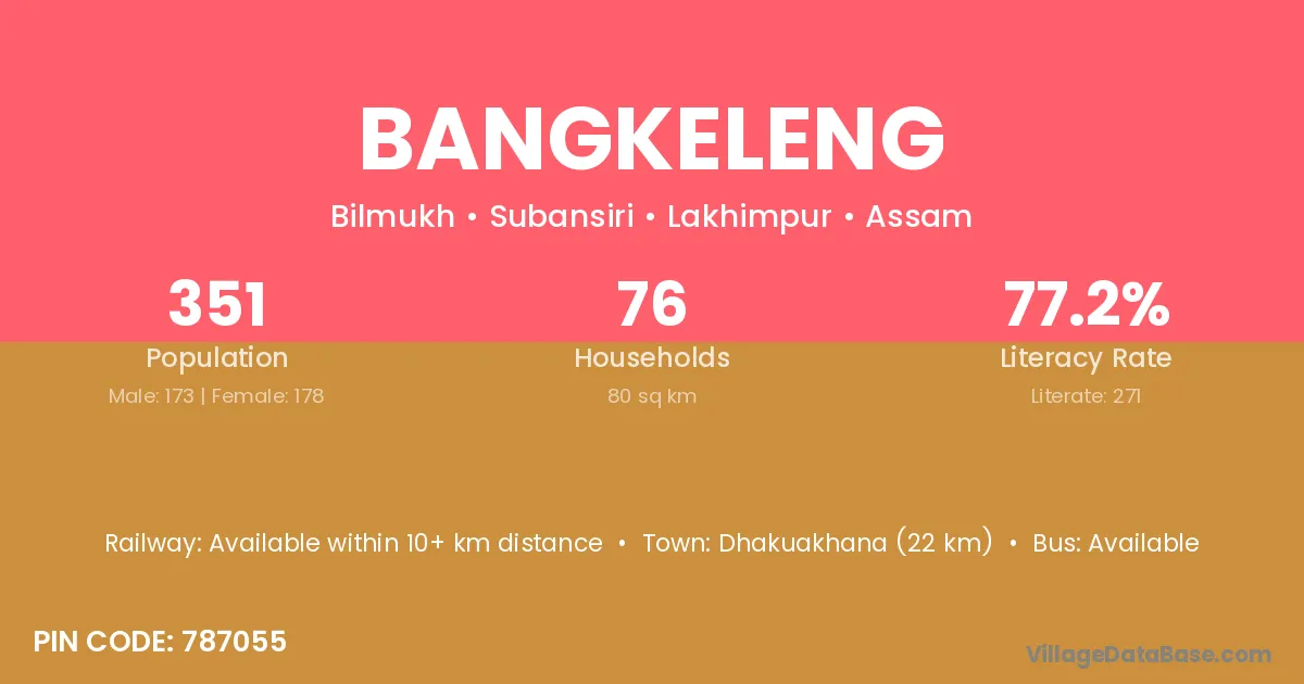 Dhakuakhana (22 km) is the nearest town to Bangkeleng village for major economic activities and is located approximately 22 km away.