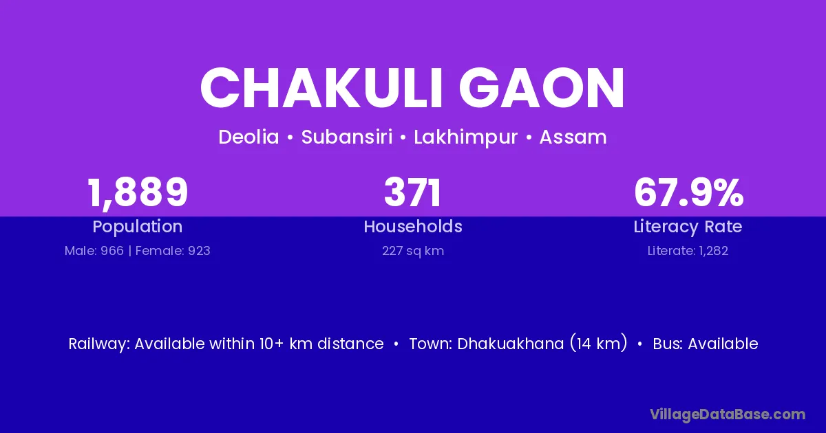 Chakuli Gaon village has a total population of 1,889 people, of which 966 are males and 923 are females.