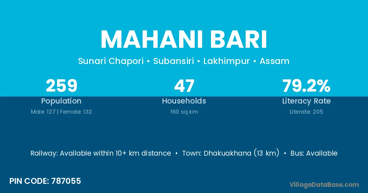 Dhakuakhana (13 km) is the nearest town to Mahani Bari village for major economic activities and is located approximately 13 km away.