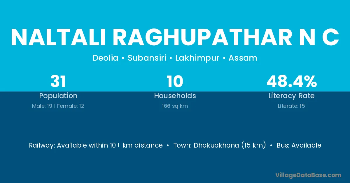 Dhakuakhana (15 km) is the nearest town to Naltali Raghupathar N C village for major economic activities and is located approximately 15 km away.