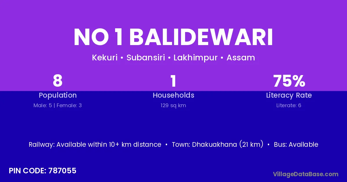 Dhakuakhana (21 km) is the nearest town to No 1 Balidewari village for major economic activities and is located approximately 21 km away.