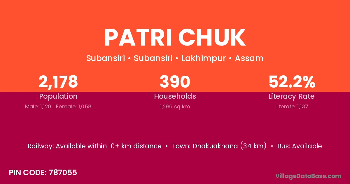 Dhakuakhana (34 km) is the nearest town to Patri Chuk village for major economic activities and is located approximately 34 km away.